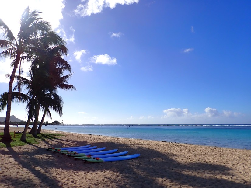 Remarkably, we found the perfect beach-side table on the back patio to people watch.  The sun shone on Diamond Head in the distance, as surfers, swimmers, sunbathers, and day-charter catamarans provided the cast for a scene right out of a 1960’s beach-party genre movie.  Frankie…Annette… surf’s up!