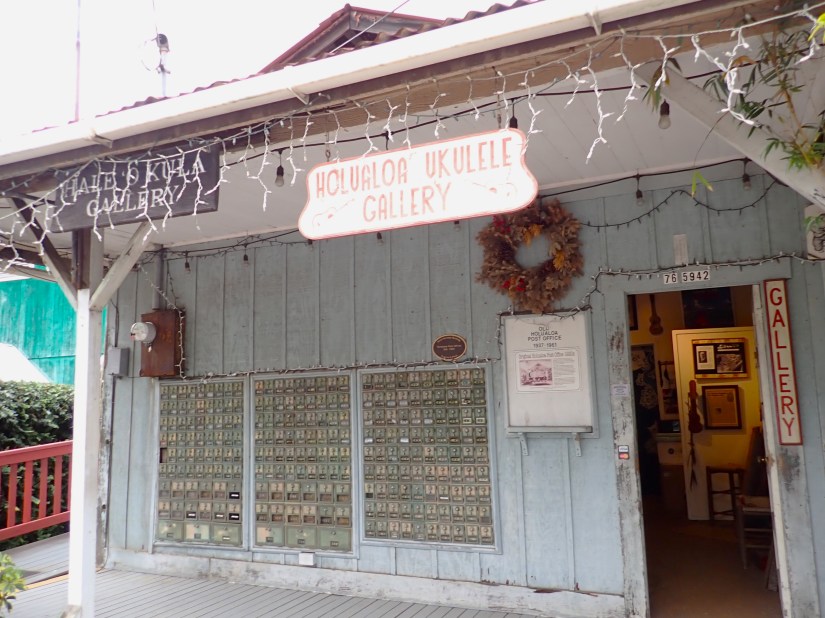 In Holualoa, we stopped at the lovely Dove Tail Gallery & Design (https://dovetailgallery.net/) which offers extraordinary woodworking and art.   Next door was the Holualoa Ukulele Shop, which formerly had been the US Post Office between 1937-1961.  It still displays its old post boxes.