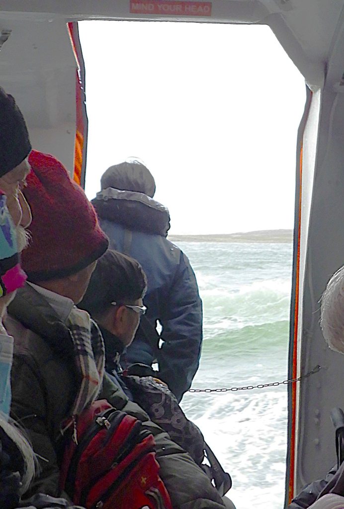 Volendam’s tenders struggled against 30-35 knot winds, causing a temporary pause in service. Those standing in tender queue were nearly taken off their feet by the wind. Coach buses (and hot chocolate!) had been brought in to shelter those still ashore, until winds subsided a tad and service resumed. Eventually, all were aboard and the Captain was happy to weigh anchor and head for open ocean again.