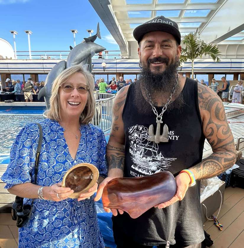 This was our fifth visit to this remarkable island, and some faces have become familiar. Andrew Christian, a seventh-generation grandson of Fletcher Christian, is one of them. Each time, I purchase a wooden bowl or platter from him. He thanks me for my repeat business, but honestly, I’m all too happy to obtain such a unique treasure.