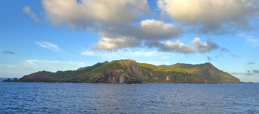 The island is steep-to, with neither a protected harbor nor any place to land tenders. So instead, the islanders come to us. For several hours, while MS Volendam slowly circumnavigates and hovers offshore, we’re treated to spectacular island views as their longboat made its way alongside and unloads.