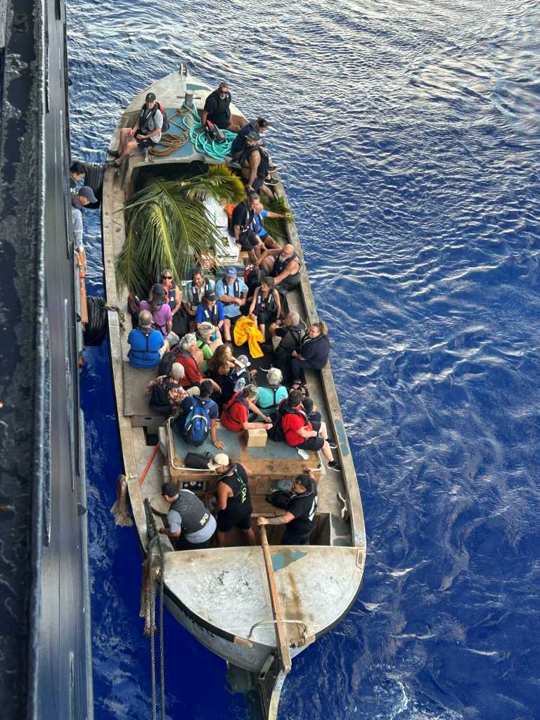 In addition to the $5,000 check Volendam presented to the Pitcairn community, we filled their longboat with supplies—food, toiletries, beverages, even ice cream—before they headed back to their small harbor.